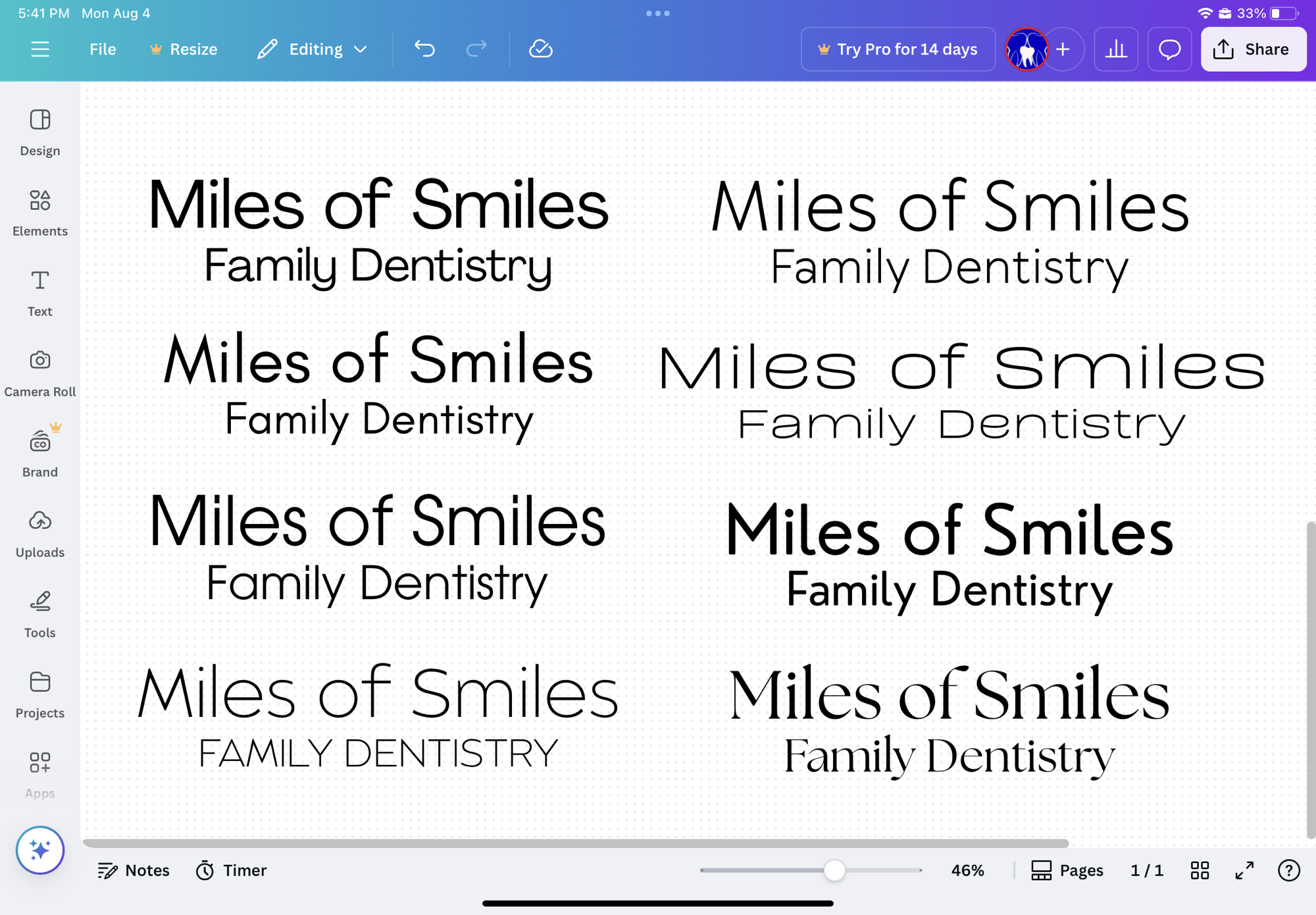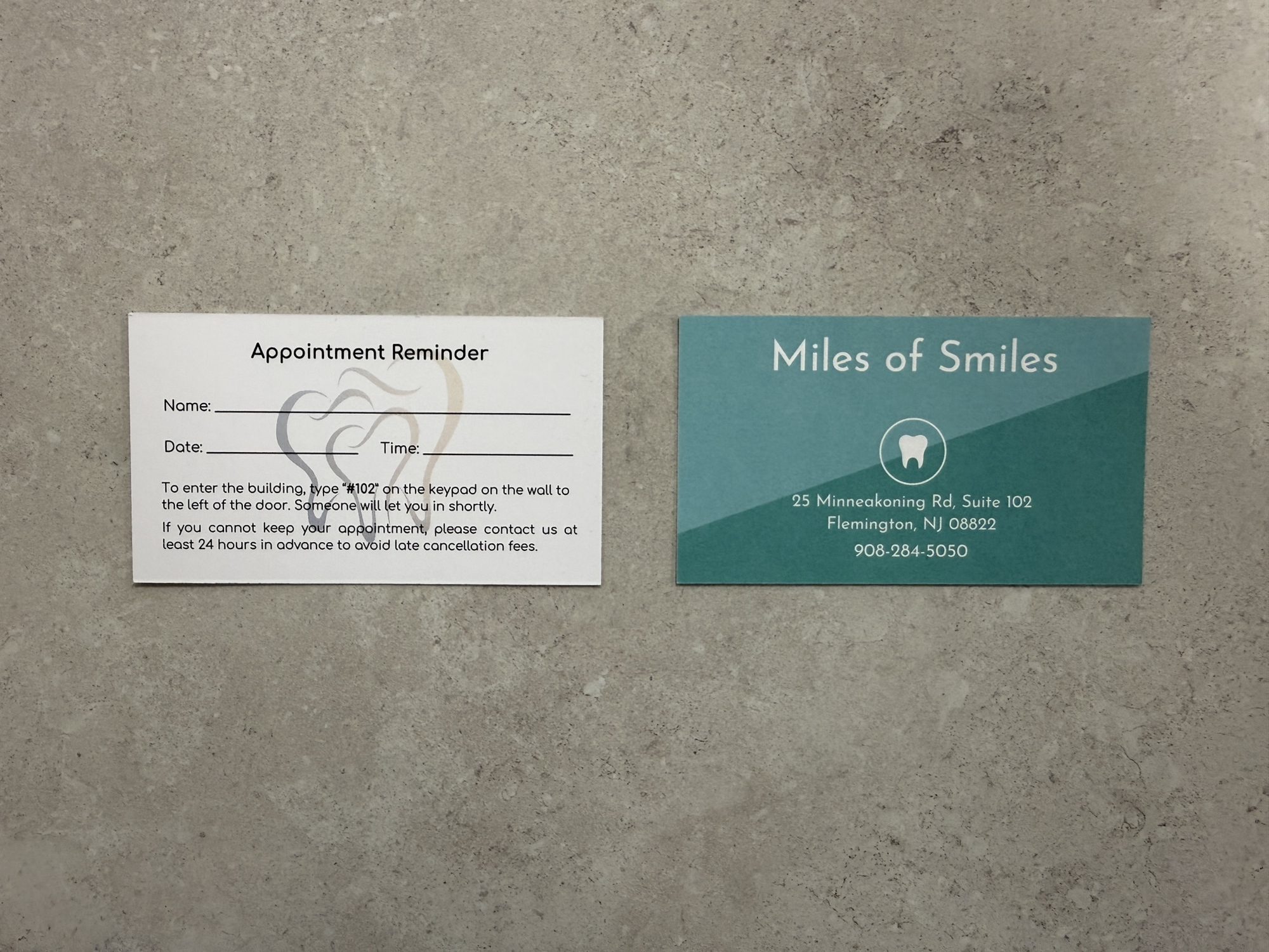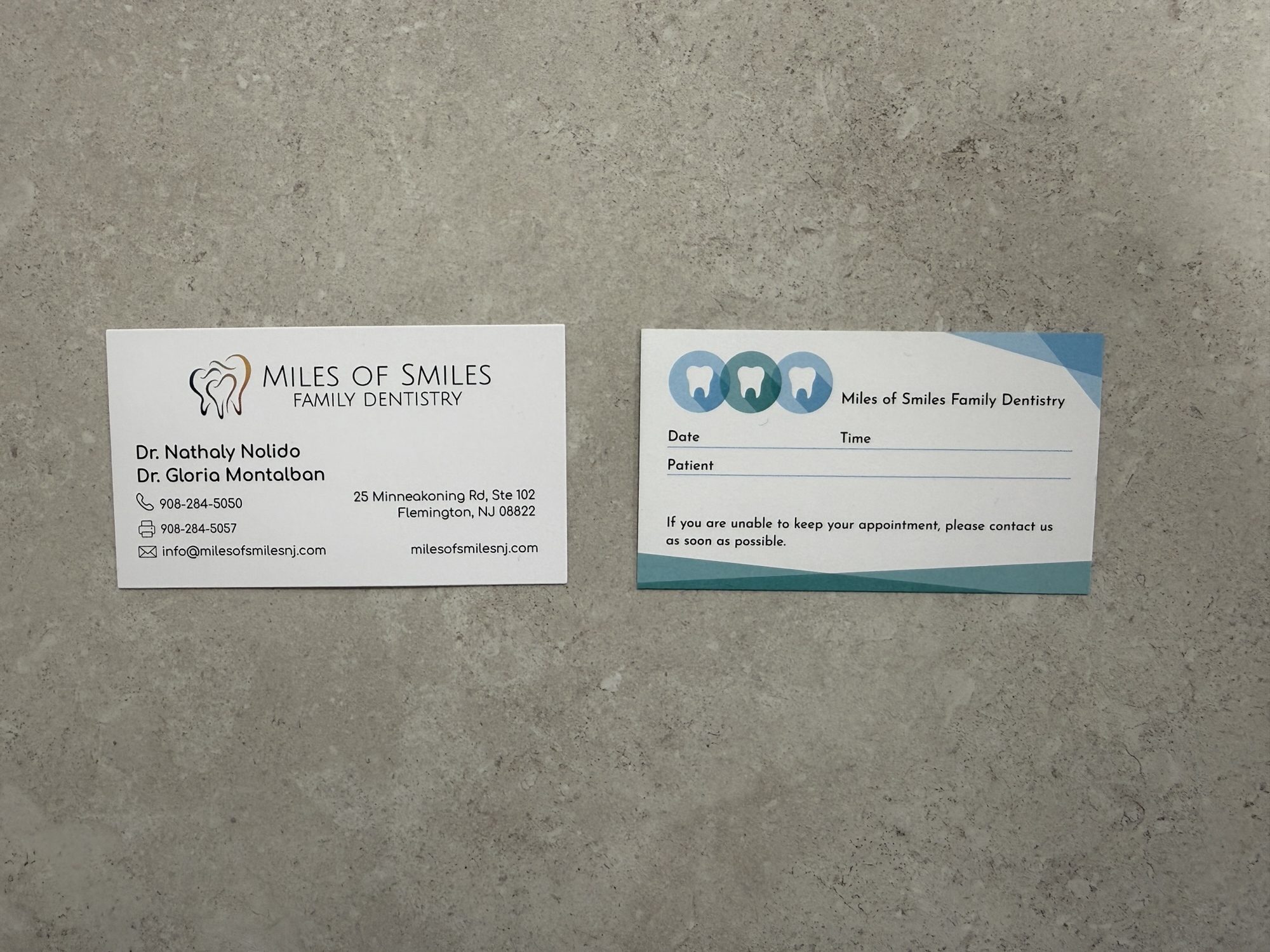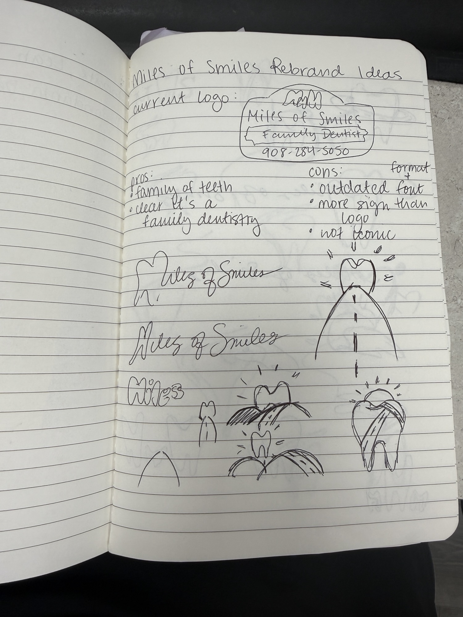 Miles of Smiles Family Dentistry has been in business for over 10 years and needed a rebrand to reflect the current trends and interests in branding for dental clinics. This project went through several iterations in order to find the right fit for the practice. the first image is the final logo, and the blue/yellow neon image was the previous branding. Through the creative process, i was able to drastically update the practice’s branding to reflect a more modern look to coincide with the location change to a brand new office. after the logo was finalized, the business cards on the left were designed and printed through canva as a double-sided business/appointment reminder card.